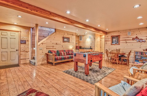 Inside, you’ll find a fully equipped kitchen with granite counter tops, as well as a cozy living room with a river rock gas log fireplace and large flat screen TV. The upstairs bedrooms boast a queen-bed in each and sliding doors that lead out to the oversized deck with stunning river views. Downstairs, the game room features a wet bar with a microwave and small refrigerator, foosball table, poker table, TV, DVD player, and stereo. There are three bedrooms downstairs, including one king, one with two twin beds, and one with two sets of bunk beds. Outside, an immense paver stone patio leads to a private hot tub and pathway to the river.
