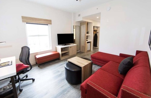Embark on your Georgia journeys from the 1 King Bed 1 Bedroom Suite with Sofabed. A sleek and stylish living room decorated with splashes of red and hardwood-style flooring invites guests to relax on a plush sectional sofabed or get work done at the desk with ergonomic chair. Enjoy beverages and snacks from the refreshment station stocked with a mini-fridge, microwave, and a Keurig brewer. Roll back the barn-style door to reveal a bright white bathroom featuring a glass-enclosed shower and Neutrogena products. Then retire to the bedroom furnished with a King-sized bed for a good night’s rest. This 360-square-foot retreat is ideal for guests seeking a one-bedroom suite in Savannah. With a stay at this hotel, you will be two minutes from the City Market and three minutes from the Savannah River. Guests of the hotel can revel in generously-sized suites with contemporary accents and custom-designed beds to lull you into a restorative sleep. Upgraded suites add separate living areas and sofabeds, perfect for when you want to have extra friends over. In select suites, you will even find whirlpool tubs and deluxe bath amenities. This hotel also boasts a café with cooked-to-order or buffet breakfasts. Other onsite amenities include a restaurant specializing in American cuisine, fitness center, 24/7 market, business center, meeting rooms, hot tub, and an outdoor pool.