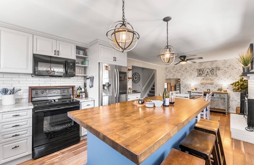 We want our house to feel like home to you! The beds arecomfortable, and there areplenty of towels, T.P, & other basictoiletries. The kitchen is stocked with all the cooking basics! Spices, oil, ketchup, coffee/creamer, dishes, and even outdoor cups for use inthe hot tub or a playing acompetitive game of cornhole. All of the 5TVs throughout the house are smart TVs. If you'd like to use your personal accounts, feel free (be sure to log out of your personal accountswhen you leave! There are three55" TVs, a 50" TV, and a 32" TV.
