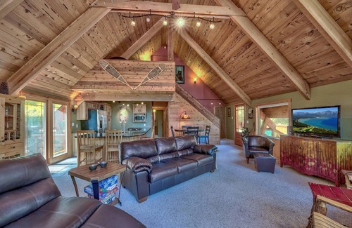 Privacy and charm with a touch of luxury, this cabin is the perfect Tahoe retreat in the woods! Dine on the wrap around deck adjacent to a year round creek. Eliminate stress with a soak in your creek-side spa and enjoy the warmth and coziness of the real wood-burning stove in the winter while you watch the snow fall through the massive living room windows. This is truly a gem! *There is a max of 5 people including children/babies in the home at any time. There are absolutely no exceptions.
