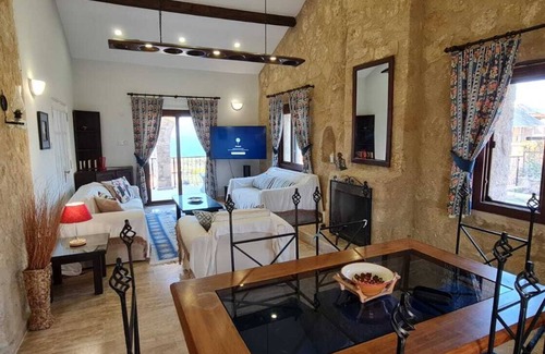Modern villa built in traditional Cyprus yellow stone style with private swimming pool and large private lawned garden. Can sleep up to 6 people in beds, plus 1 child on the settee in the sitting room . Within a short walking distance are many restaurants, a supermarket with organic food, and the best beach in Cyprus. The villa also has best views of the 5-fingers mount. All rooms are air conditioned and all their windows and doors have mesh fly-screens. Unlimited Wi-Fi, smart TV.