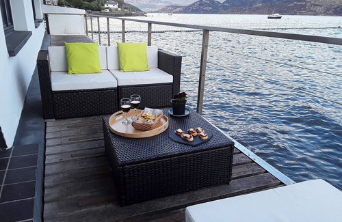 Bedroom 4: 2 x Single (3ft) Beds Ensuite: Bath With Shower Over, Toilet. Electric heaters, electricity, bed linen, towels and Wi-Fi included. Travel cot and highchair available on request. Large balcony with sitting-out area and garden furniture. Bike store. On-road parking on adjacent street. No smoking. Please note: Sea underneath balcony at high tide, low tide 5 yards.. An exceptionally spacious contemporary house built over the sea wall with stunning views across the Kyles of Bute. Waterside is located in the quiet and picturesque coastal village of Tighnabruaich, with facilities including local shops and restaurants. This detached holiday property sits on the sea wall (the edge of the shoreline) where the large balcony (20 yards), overhangs the water at high tide and looks across the open water towards Bute, Inchmarnock and Arran. Known as Argyll’s secret coast, Tighnabruaich is tucked away in a small corner of Argyll on the west coast of Scotland. Bordered by Loch Fyne and the Kyles of Bute, it is an area of stunning natural beauty, with hills, glens, rugged coastlines, white beaches, clear waters and ancient forests.