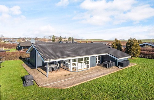Layout: Kitchen(stove(induction), coffee machine, oven, microwave, dishwasher, fridge(+ freezer)), Living/bed room(TV(german television channels, danish TV channels (DR1 and TV2), norvegian TV channels , swedish TV channels), DVD player, chromecast), bedroom(double bed), bedroom(double bed), bedroom(double bed), bathroom(washbasin, shower, toilet, washing machine), bathroom(washbasin, shower, toilet), veranda, Bubble bath(indoor, heated, 2 persons), heating(electric), garden, garden furniture, sun loungers, air to air heatpump