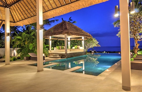 Bali Beach Villa Asmara can accommodate up to 10 guests. The five spacious bedrooms are air-conditioned and each has a private bathroom. Two rooms have a king-size bed, two have a queen-size bed and one has two single beds.