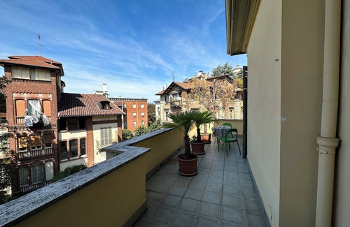 10 minutes walking from the center (500 mt. to Gran Madre, 700 mt. to Vittorio Veneto Square, 1,5 km to Mole Antonelliana, 1,5 km from the station). The first floor of a villa (over 220 square meters) in the most exclusive area of the city. Two wide terraces. Wonderful views of the city, the mountains and of the gardens of liberty houses, from every room. You can park on the street right in front of the house. We can modify the number and the arrangement of beds in any way you like.