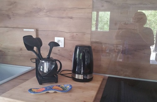 oven, induction hob, coffee maker, toaster, blender, complete crockery)