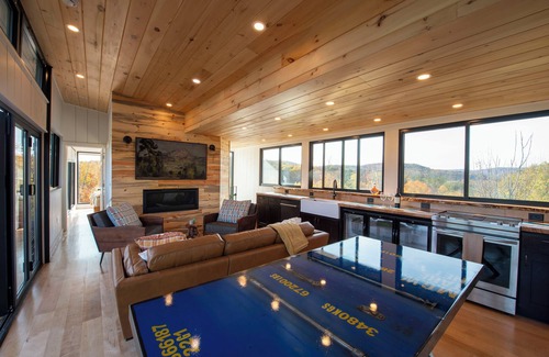 The Living Room is a perfect space with a 65 inch FRAME TV and 54 inch built in driftwood log gas fireplace operated by remote control. This perfect space can double by opening the huge accordion style glass doors to your enormous deck space with its own propane firepit. Perfect for drinks, games, and conversation. The house is well stocked with bedding, linens, and includes a washer and dryer. Your comfort is of utmost importance. There is radiant heated flooring as well as mini split units providing AC in every living space.