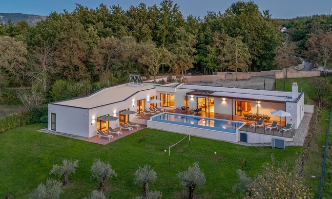 In the midst of green countryside, surrounded by forest, vineyards, olive and fig trees, you will find the peace and seclusion you have been longing for. Our Villa Istria Green is truly an oasis of peace on the east coast of Istria, just 12 km from Rabac. The modern first floor villa with 5 bedrooms can accommodate up to 10 guests and offers more than enough comfort for a relaxing vacation with family and friends. The refreshing 48m2 swimming pool forms the centerpiece of Villa Istria Green alongside the spacious garden. Here you will experience the best moments of your vacation with your loved ones: Refresh yourself in the pool, splash around with the kids, relax on one of the sun loungers while the teenagers play soccer or volleyball in the garden and enjoy the Croatian sun. Enjoy breakfast together at the dining table on the large terrace and spend cheerful barbecue evenings with your loved ones while preparing local specialties on the charcoal grill. The stylish interior is bright and very comfortably furnished. The open, fully air-conditioned living area with a comfortable sofa and TV, the dining area and the fully equipped kitchen create a feeling of "home". Five comfortable bedrooms with comfortable double beds promise restful nights and each has its own bathroom with shower. Each of the rooms is equipped with its own TV and air conditioning and offers direct access to the outdoor area. Book the luxurious Villa Istria Green and spend an unforgettable vacation with your family surrounded by the untouched nature of Istria! Experience Istria from its most beautiful side and visit Villa Istria Green. Surrounded by a forest, vineyards and olive groves, this unique villa is located in the small village of Krsan, just 12 km from the nearest beach in Rabac. Secluded yet not too far from amenities such as restaurants, bars, supermarkets and everything else you need for a carefree vacation, the location is perfect for getting to know Istria. Explore the heart of Istria and visit Pazin, where you can enjoy great gastronomy and a zipline over the gorge of Pazin Castle. Enjoy the best wines in Motovun or stroll through the streets of the smallest town in Croatia: Hum. Take a day trip to the historic city of Pula or discover the most beautiful beaches on the coast. Let yourself be inspired, spend a dream vacation and return soon. Please note that this property may accept younger groups of visitors on request. Please contact us to check this. A younger visitor group at this property is a group of people aged 25 years or younger. If you are a younger group of visitors [or planning a stag party] you may be asked to pay an additional deposit on arrival. If any damage is caused by guests in your party, the cost of repairing any damage/replacing damaged items will be deducted from the deposit. The temperature of the heated swimming pool depends on external factors, including weather conditions, and therefore the water temperature cannot be guaranteed.