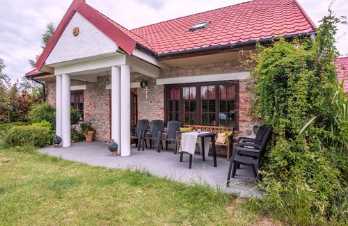 Anielino 9 km from Dobra: Single-family house "Angelino", built in 2007. 10 km from the lake, in the countryside. Private: property 5'000 m2 (fenced), garden 100 m2, meadow 1'000 m2, swimming pool (26 m2, depth 150 - 160 cm, seasonal availability: 01.May. - 30.Oct.). Tennis, volleyball, children's playground (swing). In the house: washing machine, tumble dryer. Available: bicycles (6), boat (extra). Parking on the premises. E-charging station. Shop 10 km, grocery 1.5 km, supermarket 10 km, restaurant 10 km, bus stop 1.5 km, pebble beach 10 km, rocky beach 10 km, indoor swimming pool 30 km, swimming bay 10 km, public bathing area 10 km. Riding stable 5 km. Nearby attractions: Międzyzdroje 90 km. Well-known lakes can easily be reached: Dobre 10 km. Please note: The owner does not accept any youth groups. Fishing [permit required]. Animals in the neighbourhood. This property is a stylish stone and wood house and sometimes the floors creak (this is the beauty and advantage of this property). There is a key box by the entrance door (self-check-in possible).