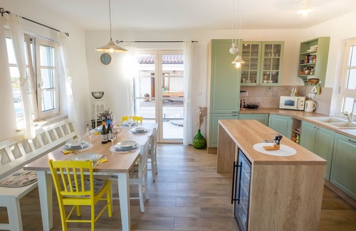 Villa Anima Calma located in a village Filipana surrounded with vineyards and olive groves, 20 min drive from Pula city. It's a completely new build two bedrooms family villa with private pool. The villa is equipped in a slightly rustic style. Consists of the ground floor with a spacious kitchen, dining room, living room (sofa can be converted into a bed 140x200cm) and a toilet. Upstairs there are 2 bedrooms with bathrooms that exude a spa atmosphere.