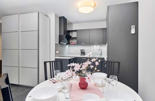 The stylishly furnished and fully equipped apartment is suitable for 4 people. The rooms layout consist of a living room with a kitchenette, a separate bedroom and a bathroom with a shower. For the maximum comfort of our guests in every season and weather, the apartment is air-conditioned. A highlight of the apartment is the backyard garden space with a terrace and garden furniture, overlooking an inner courtyard of the estate, which envelops guests in relaxing greenery and tranquility. The interior of the apartment also provides a relaxing atmosphere with its trendy, bright decor, with new white and grey furniture creating a minimalist and clean space. For guests who work remotely, the bedroom has a work space with a desk and office chair. The apartment has modern amenities, including free Wi-Fi and a SmartTV with internet access. Comprehensive kitchenette and bathroom facilities include a dishwasher, washing machine, coffee maker and hairdryer. Guests travelling by car can park for free on the private parking space in the underground garage.