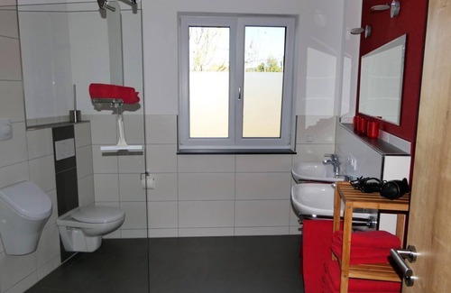 Fewo apple red, 1st floor has 3 separate bedrooms and a large balcony with great views of our beautiful rock garden. The kitchen is well equipped and the living area with leather couch, TV, compact system and everything suitable for red apple. The large bathroom has a walk-in shower, double sink and an extra toilet. On the upper floor there is also a lounge.