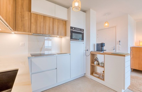Boasting a beautiful view of the sea, the holiday apartment Grains de Sable is located in Marseillan Plage. The 69 m² property consists of a living room with a sofa bed for 2 people, a kitchen, 2 bedrooms and 2 bathrooms as well as an additional toilet and can therefore accommodate 6 people. Additional amenities include a smart TV with streaming services, Wi-Fi, air conditioning as well as a washing machine. A high chair is also available. The building in which the accommodation is located has an elevator. This vacation rental offers a private outdoor area with a covered terrace and barbecue amenities.