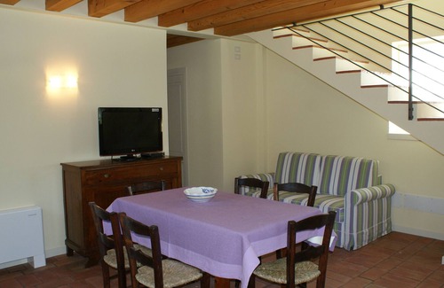 On ground floor and on the first floor, it is composed: at ground floor a living room with kitchen area, double bedroom and one bathroom for disables with shower; at first floor two double bedrooms, one bathroom with shower. Living room: kitchen area with double sink, 4 ring induction , electric oven, dishwasher, tableware and cookware for 8 people, complete with square dining table which extends for 8people, chairs, double sofa bed (120 cm mattress), TV armoire. Double bedroom: spacious with twin beds, which can be joined together on request, 2 bedside tables, two-door wardrobe, desk with DSL jack and TV socket, chairs. Shower room: basin, toilet, bidet, decorative radiator, shower, hair dryer.
