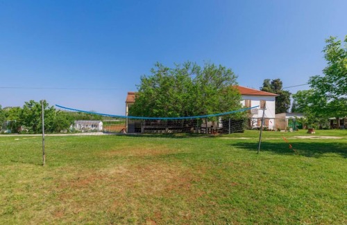 Apartment house "Vesela", surrounded by meadows. In a quiet, sunny position, 800 m from the sea, from the beach, in the countryside. For shared use: property 1'300 m2, garden with trees, meadow. Badminton, barbecue, children's playground (swing). In the house: internet access, trampoline. Parking at the house on the premises. Shop 1.2 km, restaurant 1.2 km, bus stop 8.2 km, shingle beach 1 km, rocky beach 800 m. Golf course (18 hole) 5 km, tennis 2 km, walking paths from the house 500 m. On the children's playground badminton net.
