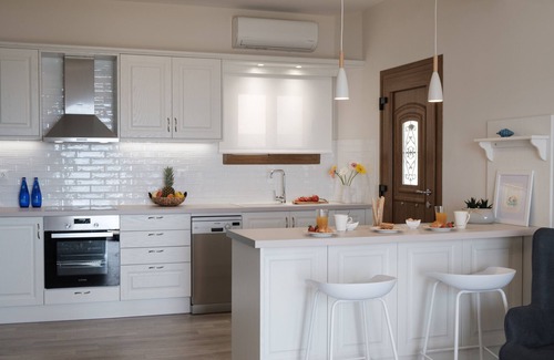 Armikes Beachfront Suite 1: This bright modern furnished suite covers a living space of 50 sq.m on the ground floor of a newly built building a few steps from the sandy beach of Agios Georgios. Armikes Suite can accommodate up to three guests, two in a large bedroom with king size bed and sea view plus one in the living area on a sofa bed. The luxury suite also features an open plan fully equipped kitchen with all amenities and a spacious shower with washing machine and cabinet enclosure. A large glazing door leads from the living area to the sunny veranda with an amazing view to Agios Georgios Bay. A large grassy garden extends in front of the building.