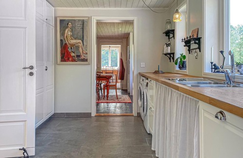 Welcome to this enchanting holiday home, which will delight you with its bright and cosy interior. Here you have plenty of space to spend relaxing days with your loved ones surrounded by peace and nature. Look forward to cooking in the inviting kitchen and plan your adventures over harmonious meals. Listen to the crackling of the open fire while you relax and read or spend cosy evenings playing games with your family.