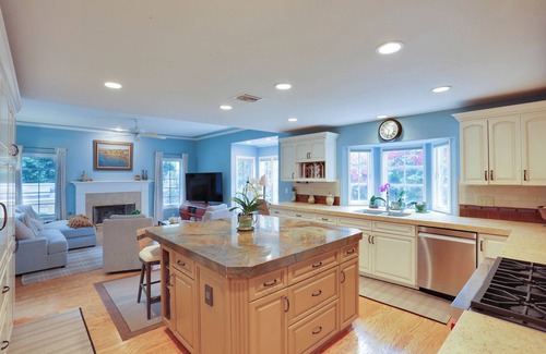 Indulge your culinary passions in our fully stocked chef's kitchen, seamlessly integrated with an inviting family room and elegant dining area. The family room also includes an additional dedicated work space. High-speed WiFi is available throughout the home, providing ample workspace for remote work, leisurely browsing and uninterrupted streaming.