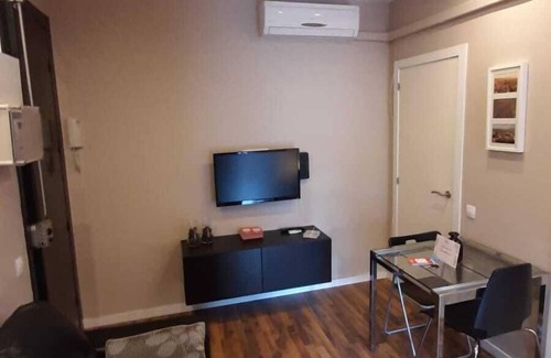 The apartment in Barcelona also has a living room in which a sofa, a piece of furniture with a television and a table have been put so that all customers can eat.