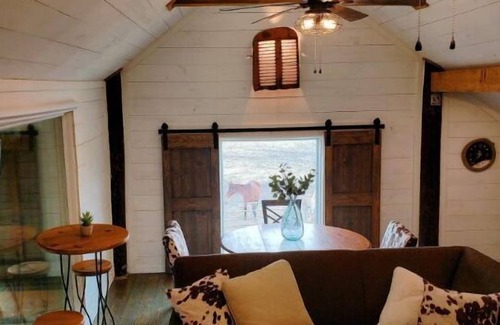 Have a true Texas experience by staying in the barn loft at a mini ranch with registered Texas Longhorns. A new loft has been constructed with whitewashed shiplap, rustic timbers and telephone poles. Three oversized windows that allow you to look down into the stables along with the horses and longhorns. The bathtub/shower is a converted water trough. The open floor plan includes 2 queen size beds, a kitchenette and entertainment center. Vaulted ceilings make for a cozy stay.