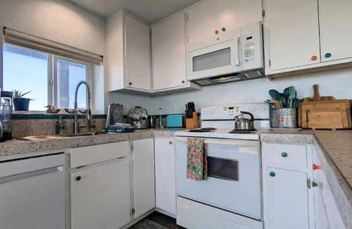 A fully outfitted kitchen - Electric Range, refrigerator, microwave, crock pot, blender, bread maker and all the pots pans dishes and flatware you'll need.