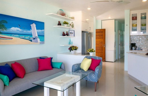 The beauty and calm of the crystal blue Caribbean Sea is right outside your door and our charming town square only a short 15-20 minute stroll away. This cozy third-floor apartment has a balcony, where you can dine while enjoying the amazing view. Perfect for 3 adults or a family with smaller children. Base rate is for 2 people. Additional guests for an additional charge. Extra person per night $30 USD . The master bedroom has a king bed and the second small room has a queen bed. Fully equipped kitchen, living room, flat screen TV, AC, and free WiFi. Lounge chairs on the beach and by the pool. Linens supplied. 500 thread count sheets. Lovely Mexican details. The central office at Abbey del Sol is just a block away with helpful, friendly English-speaking staff to help with anything you need.