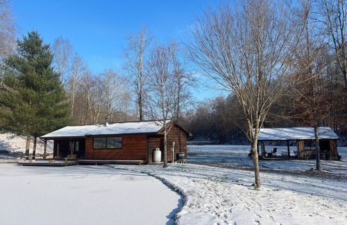 Surrounded by three ponds and a creek, this cabin in nestled in the woods and a beautiful place for a quiet get-a-way. You can enjoy fishing off the deck or around the pond. There's a shelter with an outdoor kitchen and a bonfire area. Open concept kitchen and living space with a wood burning stove, spa-like bathroom and one bedroom with a king size bed. Up to two small dogs welcomed.