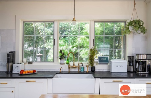 The upstairs is an open loft with cosy mid-century seating and a window-facing work area for those times when you have to catch up on emails. The main bedroom has sky high ceilings, soft natural light, and beautiful spa shower and closet en-suite.