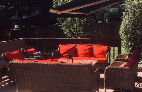 Beautiful family owned 5 bedroom, 3 bath vacation home with cable & Wi-Fi located in a quiet neighborhood on Bend's westside. The home is only a few blocks from the beautiful Deschutes River and is tastefully decorated and furnished for your comfort. The kitchen is fully stocked with all items for your cooking needs. A large deck off the kitchen (550 sq ft.) with a gas barbecue provides you with a great patio setting to enjoy the beautiful weather of Central Oregon. This 5 bedroom home has a nicely furnished kitchen/family room with a 42 in, and is 2950sqft.. TV, DVD, stereo surround system to enjoy while relaxing, cooking, and dining. Wi-Fi is available. There is also a large living room/ formal dining room on the main floor. The primary bedroom and bath has a separate shower and large soaking tub with a large walk-in closet . The house sleeps 8. There are 4 bedrooms upstairs all w/ queens including 1 w/ a twin trundle bed. There is a large bathroom w/ tub/shower upstairs as well. The downstairs bedroom has a double bed and a separate guest bath w/ shower. There is a large bonus room upstairs with a ping pong table, TV and DVD player for you to enjoy.