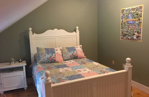 Our clean, comfortable guest house is nestled down the hill behind our family home on our four acre property. During your stay, you will enjoy a quiet, peaceful setting as you are nestled in the woods surrounded by trees, fields, and a creek.
