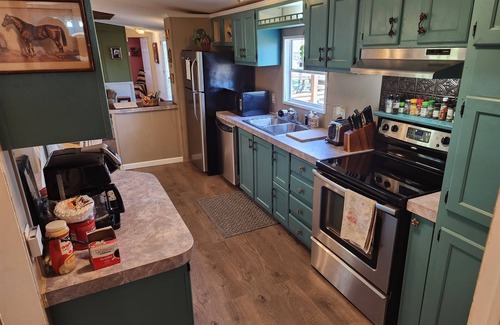 This is cozy updated smoke free mobile home. Sleeps 4. 2 bedrooms and 2 full baths. Fully equipped kitchen, a stocked laundry room, 2 covered decks, a gas grill and fire pit on the front deck and an outdoor fire pit with firewood in the back. It is nestled behind the main home on the edge of our 5-acre gated horse farm overlooking 1 of 2 horse pastures. It comes with access to a 1/4 acre fenced dog run for guests with pets and a place to park 2 vehicles. (Sorry, no smoking allowed on the property.)