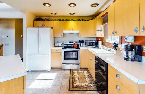 This home features three stories offering 2,253-square-feet of mountain living for your next family vacation. It is located close enough to town, but is well off the beaten path to assure you a private and quiet retreat. The furnished wraparound decks and patios offer spectacular mountain views, and inside, you'll have gorgeous floor-to-ceiling windows that let in lots of natural light and provide wonderful views. The living space is dressed with lots of comfortable furniture and rustic décor. Use the full kitchen to get in touch with your inner chef while you prepare a nutritious family meal to enjoy on the handsome dining table.
