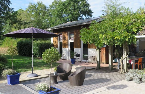 This beautiful single-family house "Le Préau" is a vacation rental situated in the hamlet Le Petit Then, 2 km from the center of Saint Vincent-de-Paul, France. It offers a private, natural state property of 1,500 sq m with a swimming pool, yard, Internet WiFi, and parking for two cars on the premises.