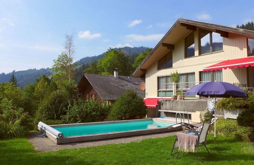 Eriz 20 km from Thun: Large, very comfortable chalet "Mooshütte", 1'040 m a.s.l 3 storeys. 2 apartments in the property. In a quiet, sunny position on a slope, 50 m from the edge of the forest, 500 m from the skiing area, 200 m from the river, in the countryside, south facing position. Private: well-kept garden with lawn and trees, lawn for sunbathing, swimming pool (3 x 7 m, depth 160 cm, seasonal availability: 01.May. - 15.Sep.) with shutter cover. Terrace, garden furniture, barbecue. In the house: central heating system. Available: bicycles (2). Parking (for 2 cars). Grocery 3 km, supermarket 20 km, restaurant 500 m, bus stop 180 m. Tennis 270 m, walking paths from the house 20 m, skisport facilities, ski school, sled run, cross country ski track 500 m. Nearby attractions: Thun 20 km. Well-known ski regions can easily be reached: Snowpark Eriz 500 m, Adelboden-Lenk, Jungfrau Region 70 km. Well-known lakes can easily be reached: Thunersee. Hiking paths: Naturschutzgebiet Rotmoos, Zulgweg, Hohgant. Please note: car recommended.