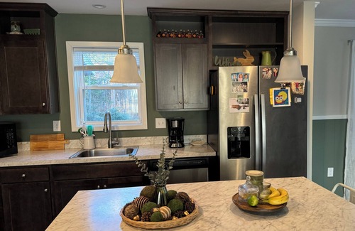 The floorplan includes a modern kitchen, bar, dining room and living room with a flip-switch gas fireplace. Enjoy fiber internet and a smart TV for streaming or gaming. Comfortably accommodates six adults with 3 bedrooms and 2 baths. The main bathroom, private to bedroom 1, has a walk-in shower and dual sinks. A shared bathroom close to bedrooms 2 and 3 has a bathtub and shower. Includes full laundry room and appliances.