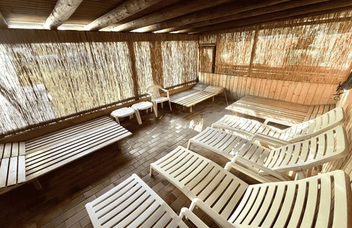 There is also a small swimming pool (free of charge) and an infrared cabin with a coin slot.