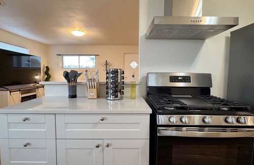 Berrendo Sky Homestead is a remodeled Santa Fe–style retreat on the quiet edge of Roswell, just 4 minutes from Main St. Enjoy breathtaking mountain views you won’t see in town, a fully stocked kitchen with coffee bar, washer/dryer, and bathrooms with all essentials. There are 3 bedrooms plus sofa and futon beds. This home offers peaceful country charm, modern comfort, and quick access to town, making it perfect for a wide range of guests. Some pets may be considered with pet fee.