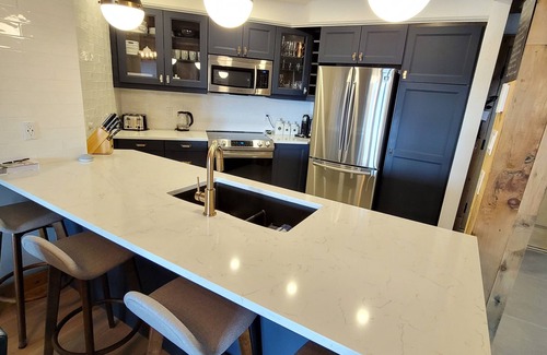 Kitchen - features a deluxe fully equipped kitchen with heated floors and full size stainless steel appliances, french door fridge/freezer, and GE dishwasher, new Samsung electric range and all kitchen accessories have been replaced (coffee maker, kettle, toaster, dishes, flatware, glasses, pots and pans, blender etc) so you can be rest assured that we have everything you need. Also included is a Nespresso Vertuo Coffee machine. You will love the breakfast bar with seating for four that opens to the living and dining room.