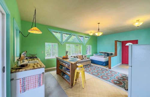 The guesthouse has a queen size bed as the main bed, and two queen pull out couch beds, outdoor patio with a charcoal BBQ. The property is on 3 acres of lush beauty with an organic orchard, fruit trees galore (help yourself when in season....) papaya, banana, lilikoi (passion fruit), coffee, oranges, mac nuts, avocado, lychee, mango, guava, , tangerines, lemons, ...Enjoy your favorite meals in a beautiful full size kitchen. Chill out in a hammock or for a truly dreamy night we have unmatched stargazing with Hawaiis zero light pollution policy. We have that 'away-from-it-all' feeling but it's only a 20 minute drive to beaches and fabulous restaurants! We have added everything we can think of to make this an amazing experience for you & leave with memories that will last a lifetime. Inside the guesthouse you will enter into an open living/dining kitchen area with fun colors. The building has the island life vibe with lots of beautiful picturesque windows that overlook southpointcharm with 21st century amenities - 4 burner stove/oven, sink, a coffee tea bar microwave, toaster and refrigerator. The water - the entire property runs on a water catchment system. Guests must consult host before reservation with children under 10 yrs old.