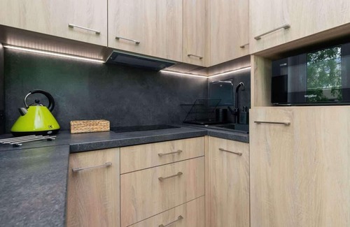 This cozy, cheerfully decorated apartment is the perfect vacation spot for families! The 28-square-meter space houses a living room with a kitchenette, a bedroom and a bathroom with a shower. The apartment also comes with a private balcony, facing quiet side and overlooking trees. Fitted with garden furniture, the balcony is a perfect spot for enjoying a morning cup of coffee or an evening dinner. Any meals can be easily prepared in a kitchenette equipped with useful appliances (a microwave, a toaster, a coffee machine). Other amenities include high-quality multimedia (a SmartTV with internet access and WiFi connection with 5Gb speed), a washing machine and a hairdryer. All of this can be enjoyed in a homely atmosphere created by charming bright decor with green elements that immediately put you in a holiday mood. Additionally, guests travelling by car can park for free on a publicly accessible outdoor parking in front of the building.