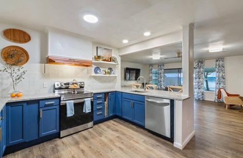 Nested on a bluff overlooking the lake, Blue Vista is a cheerful house with a relaxed personality. Enjoy the amazing view, fully-stocked kitchen, hot tub, fire pit, and outdoor dining. Work remotely, go fishing, and finish each day watching the sunset from the ambient-lit hot tub.