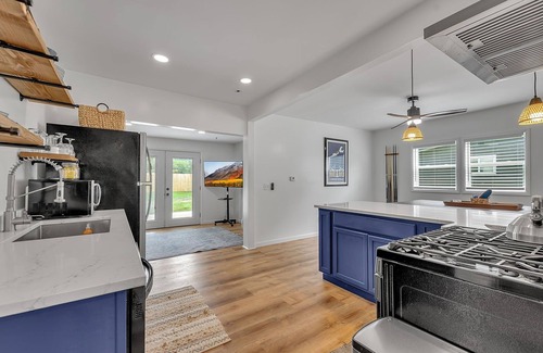 Our home features 3 beds, 2 baths, open-concept living area, office space, brand new fully-stocked kitchen and plenty of outdoor space including a covered front porch and fireplace.
