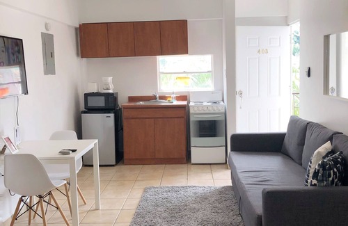 Incluye entre otros: smart TV y sistema RoKu, WiFi, tabla y plancha, aire acondicionado, detector de humo, closet con tablillas, artículos de limpieza como escoba, recogedor, cubo, mopa.