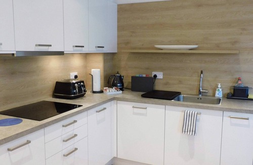 The apartment consists of a master bedroom with en suite bathroom and a 2nd bedroom, both have double beds furnished with high quality bed linens. There is a gorgeous open living space housing the living room with a comfortable leather sofa and chair, smart TV and mood lighting, a dining table for 4 and fully equipped, modern kitchen. There is another full bathroom and laundry room.