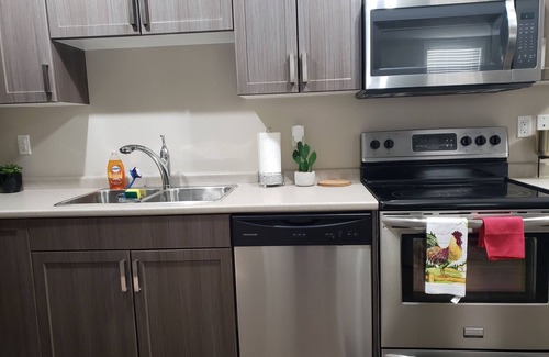 Our kitchen is also stocked with plenty of paper towels, sponges, wipes, and various other kitchen cleaning supplies. Enjoy the stainless steel under mount sinks; the stylish cabinetry and the trendy vinyl plank floors with lots of storage spaces as well as a large kitchen pantry.