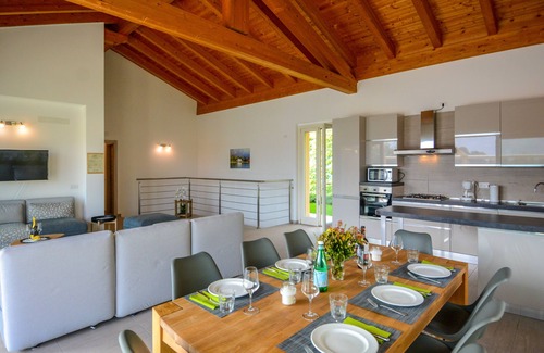 In brand new villa with 2 apartments for 8 people each which can ideally be united to one private villa for a maximum of 16 people. Stunning view on Lake Como with Isola Comacina and surrounding mountains. Swimmingpool and sun deck.