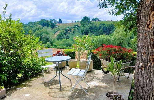 A single house nestled in lush greenery, the Brécat house has been completely restored. It overlooks a balcony facing the Pyrenees. All comforts and beautiful, bright spaces. Simple, contemporary decor highlighting the old beams and original timbers. Ground floor: - Equipped kitchen (oven and microwave, gas hob, fridge-freezer, dishwasher) opening onto a terrace. - Fully equipped living room (TV, CD player). WC. 1 bedroom (1 queen-size bed) with adjoining bathroom (walk-in shower). Storage room (washing machine). Upstairs: - 1 bedroom (2 single beds), bathroom/WC. Large mezzanine (books, board games, DVD player). Beds made upon arrival. Towel rental available. Heating available at an additional cost (heat pump and convector heaters). Large, fully enclosed garden offering breathtaking views of the mountain range. 2 terraces (South and shaded to the West), garden furniture, gas grill, sun loungers.
