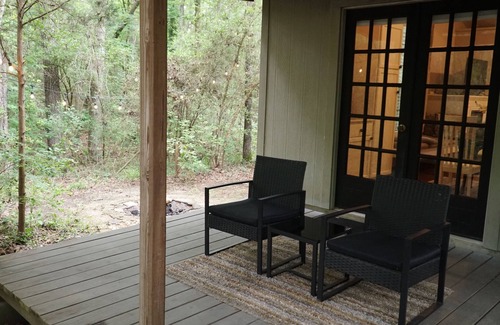 Bucks Head is a secluded cabin tucked away in the woods of East Texas. This open-concept cottage includes a king bed, a loveseat, and a comfortable occasional chair for watching your favorite streaming app on TV. An electric fireplace provides the perfect romantic ambience year-round and additional warmth in the winter.