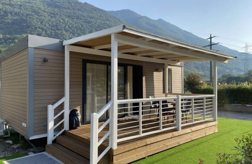Gudo 16 km from Locarno: Modern, cosy bungalow "Isola", surrounded by trees and meadows. 6 houses in the resort. On the outskirts Gudo, in a sunny position, in the countryside. For shared use: natural state property, beautiful, well-kept garden, meadow, swimming pool angular (24 x 12 m, 300 m2, depth 40 - 160 cm, seasonal availability: 20.May. - 15.Oct.) with internal staircase. Outdoor shower, table tennis, children's playground. In the complex: reception, restaurant, lounge, WiFi, playroom, table football, shopping facilities, kiosk, storage room for bicycles, central heating system. Breakfast and half board possible on request (extra). Motor access to the grounds. Grocery 50 m, supermarket 4 km, restaurant 50 m, café, bus stop "Linie 311" 500 m, railway station "SBB- CFF Riazzino" 4.4 km. Cycle lane 200 m. Nearby attractions: Castelli di Bellinzona, Piazza Grande, Locarno, Ascona, Ronco sopra Ascona, Isole di Brissago, Cardada, Madonna del Sasso, Mercato Luino e Cannobio IT. Well-known lakes can easily be reached: Lago Maggiore, Lago di Lugano, Lago di Como. Hiking paths: Valle Verzasca, Centovalli, Vallemaggia. Please note: suitable for families. Groups of teenagers on request only. The complex has another 5 bungalows for rent.