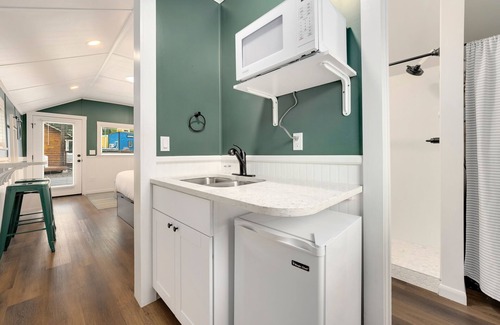 Cabin 1 has a queen bed with storage underneath and a twin pullout bed. There is an attached bathroom with a shower, as well as a kitchenette including a microwave and mini-fridge. There is a bartop inside for dining, as well as patio furniture outside to enjoy the mountain atmosphere. This cabin has heat and air conditioning to help keep you comfortable. There is quick access to the Cache la Poudre River and there is a coffee cart and market on-site.